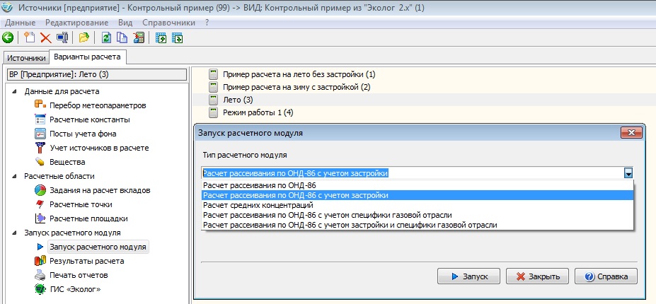 Запуска расчетного модуля -> из выпадающего списка выбирается модуль "Расчет рассеивания по ОНД-86 с учетом застройки". Количество расчетных модулей зависит от приобретенной комплектации программы.