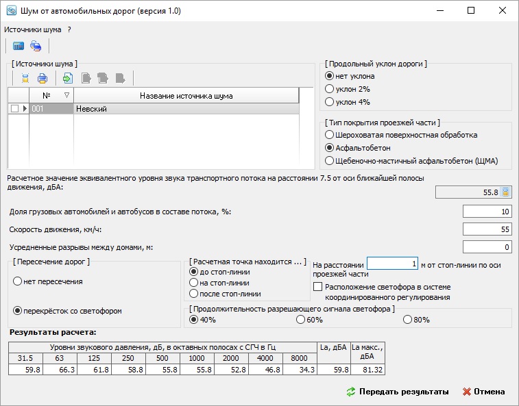 Модуль «Шум от автомобильных дорог» предназначен для расчёта значения эквивалентного и максимального уровня звука при движении транспортного потока в реальных дорожных условиях. Программа рассчитывает эквивалентные уровни звукового давления в девяти октавных полосах, а также эквивалентные уровни звука La с учётом характеристик транспортных потоков.
