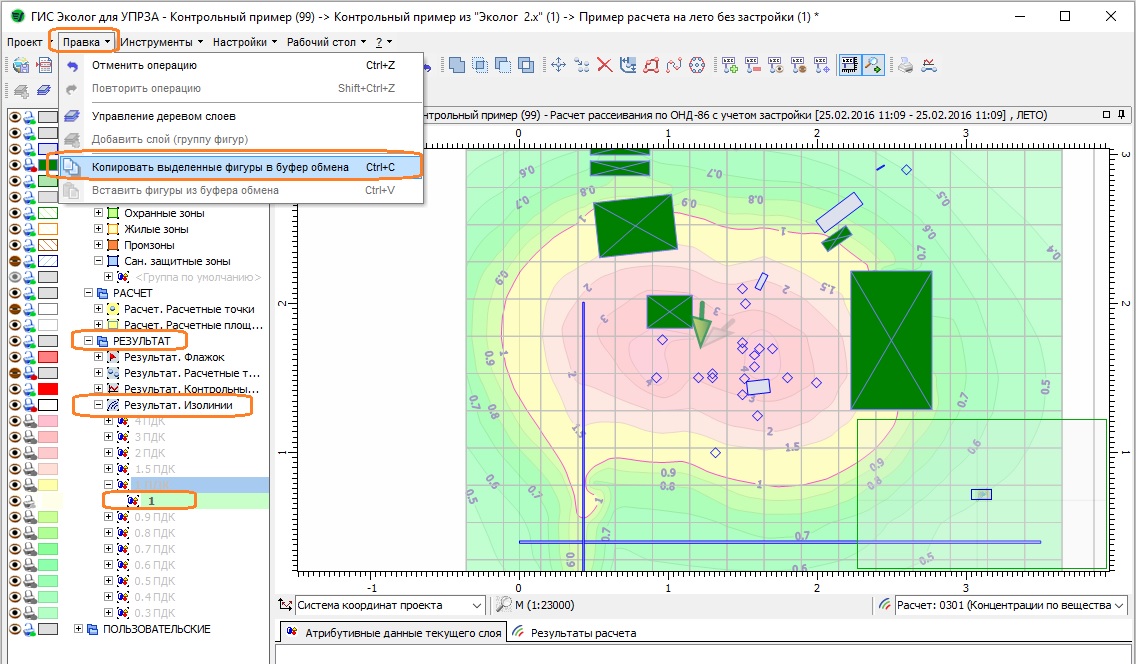 - В группе "РЕЗУЛЬТАТ" - "Результат. Изолинии" выбрать необходимую изолинию, например 1 ПДК и скопировать ее в буфер обмена (меню "Правка"). - В группе "ОСОБЫЕ ЗОНЫ" выбрать например "СЗЗ" и через меню "Правка" произвести вставку скопированной изолинии на предыдущем шаге.
