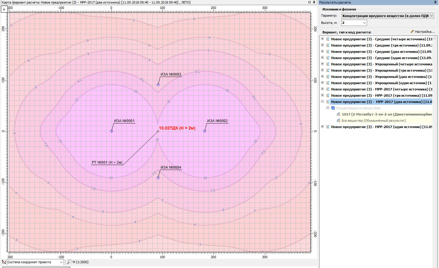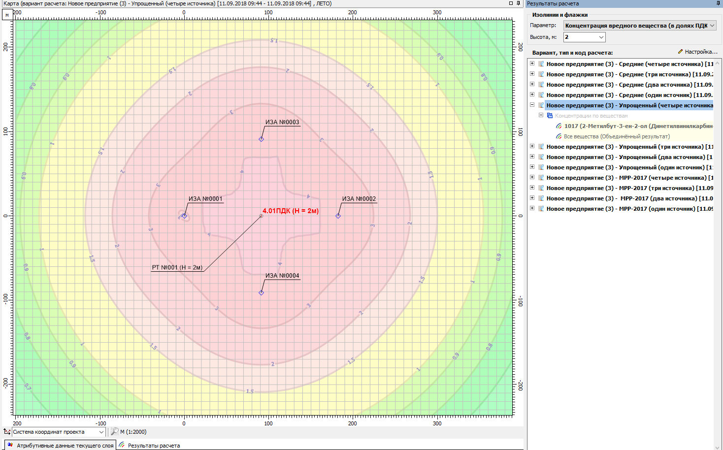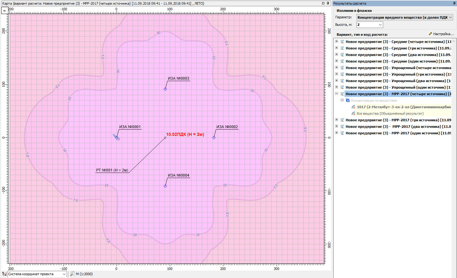 3. При одном источнике концентрация в точке для Упрощенных средних и для "Как раньше в ОДН-86 (См/10)" совпадают (ведь мы взяли круглую розу ветров). При дальнейшем росте количества источников результаты разнятся, тем больше, чем больше количество источников.