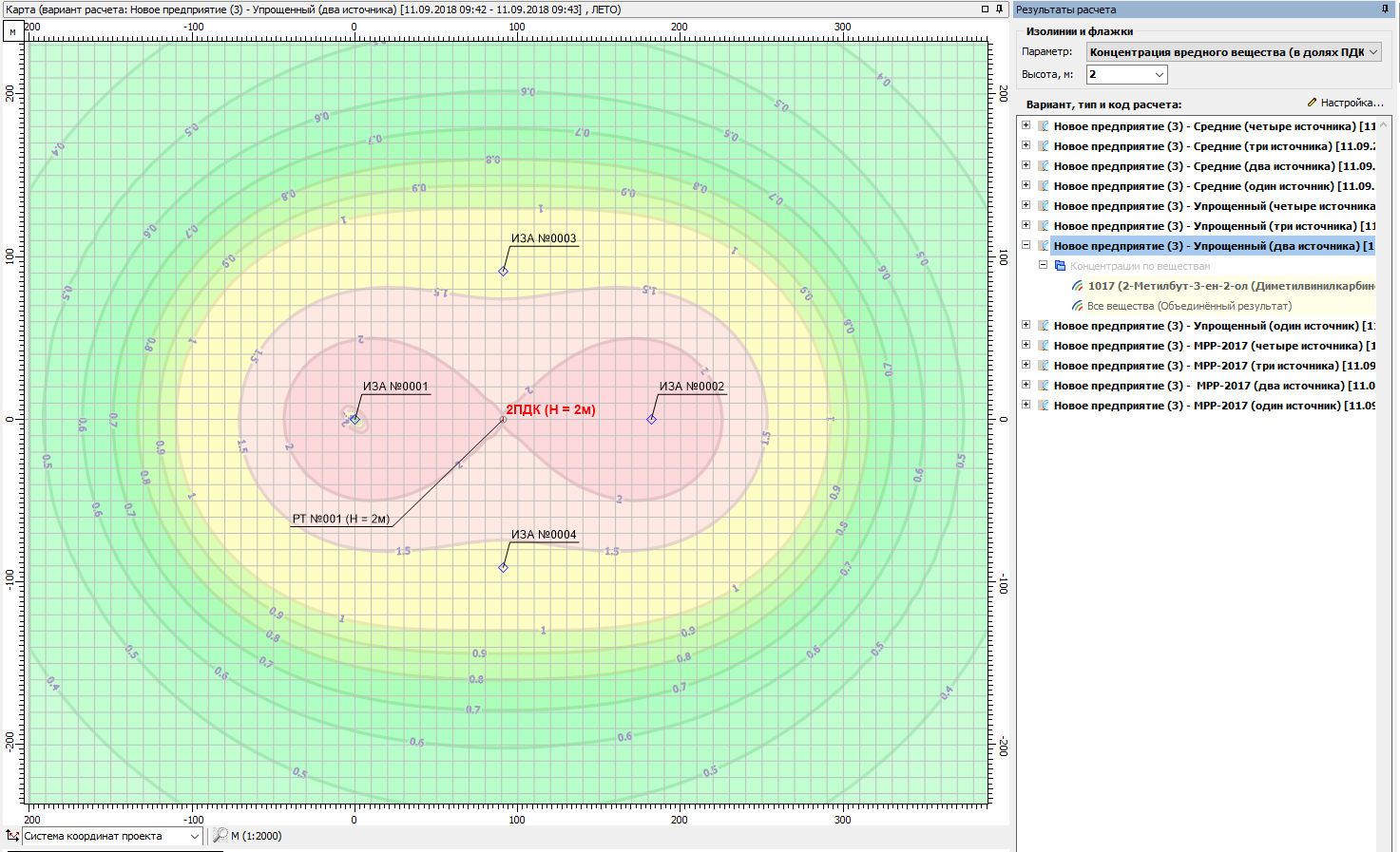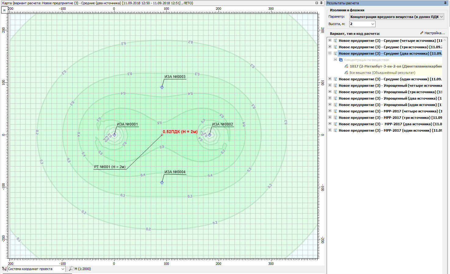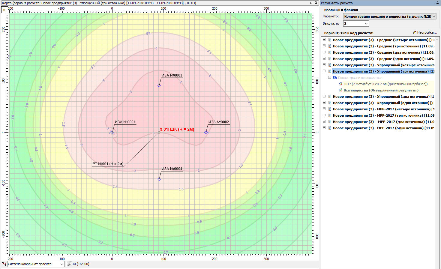 2. В Упрощенных средних наблюдается кумулятивный эффект, как в полноценных Средних. С ростом числа источников концентрация в точке увеличивается пропорционально количеству источников.