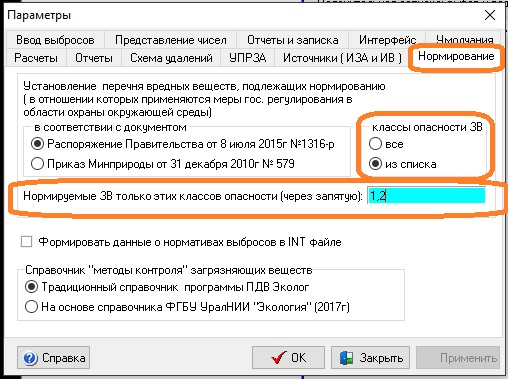 - добавлена возможность ограничивать список нормируемых веществ, веществами выбранных классов (1 и 2 - например);