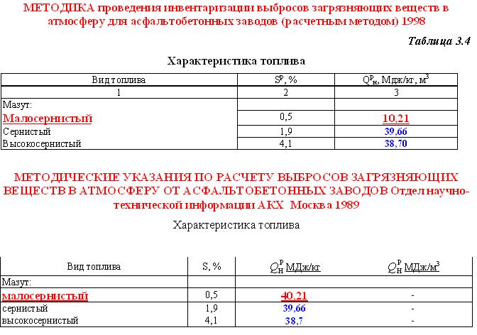 Анализируя методы по выбросам АБЗ 1989г и 1998 г. можно сделать вывод о том что это "косячок" выделен красным цветом, остальные виды мазута (синий цвет) одинаковы! В методе по котельным теплота сгорания "сорок", в паспорте на мазут тоже, в ГОСТе не ниже "сорока" мдж/кг, можно есчо перечислять.....!!!! ЭТО просто очередная "очипятка"!!!loa-77@mail.ru писал(а):10,21 - это не опечатка. В программе АБЗ стоит такая теплота мазута малосернистого. и В методике проведения инвентаризации для асфальтобетонных заводов 1998г.таблица 3.4.