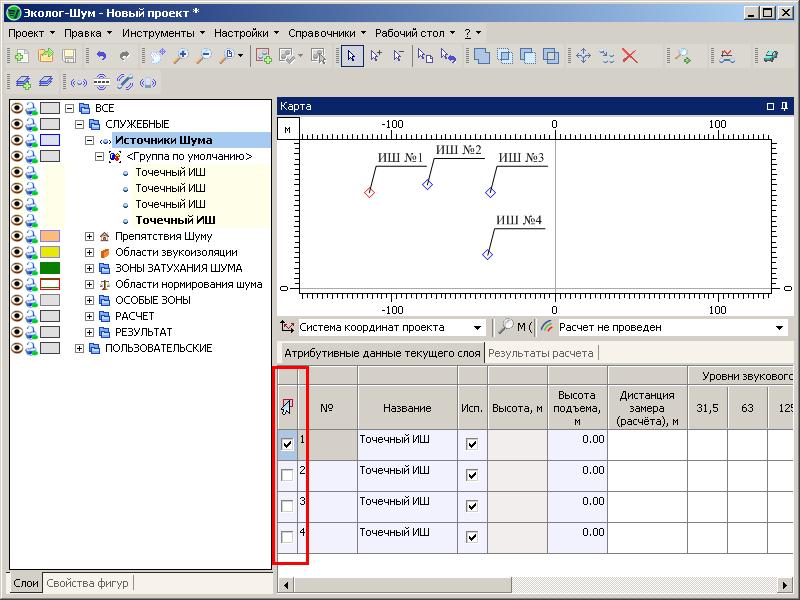 Для редактирования объектов в программе "Эколог-Шум" вер. 2.0 они должны быть выделены.