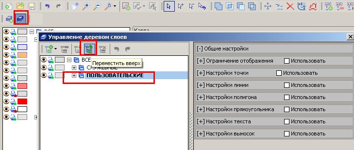 Кнопка с изображением трех листиков (над деревом слоев), откроется окно "Управление деревом слоев". В этом окне выбрать "ПОЛЬЗОВАТЕЛЬСКИЕ" и переместить эту группу вверх.