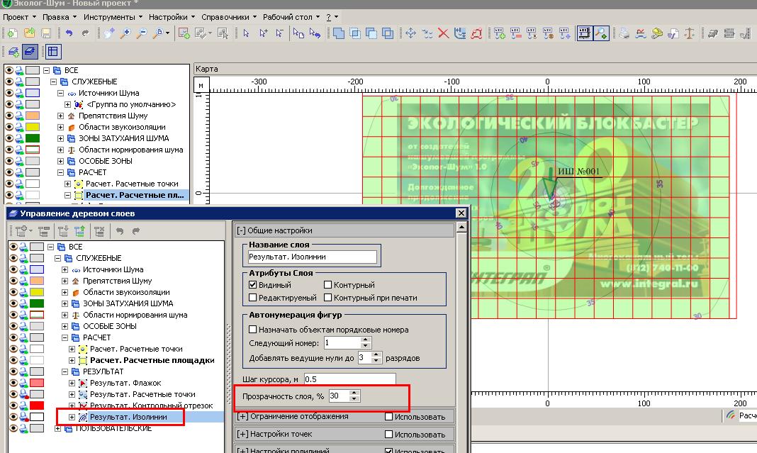 После проведения расчета в программе и выбора результатов расчета, появляется карта расчета с изолиниями, при этом объекты служебных слоев остаются видимыми, а объекты пользовательские нет. Поясните пожалуйста с чем это может быть связано?