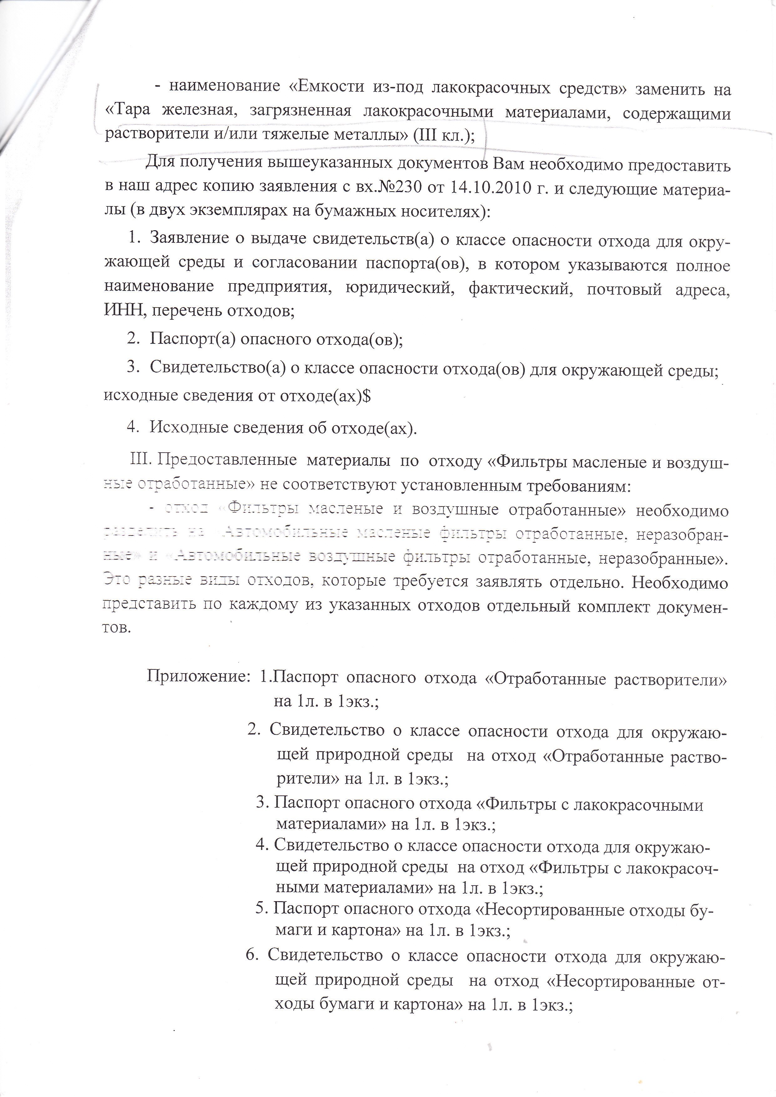 - для отхода «осадки очистных сооружений мойки автотранспорта», в представленных материалах, по отнесению отхода к классу опасности для окружающей среды расчетным методом, для компонентов «железо», «нефтепродукты», указано недостаточное количество значений первичных показателей (п. 7 приказа МПР № 511 от 15.06.2001 г.); - для компонентов отхода «осадки очистных сооружений мойки автотранспорта»: «хром», «кадмий», коэффициент степени опасности для окружающей среды W не соответствует Приложению 2 к приказу МПР №511 от 15.06.2001 г.
