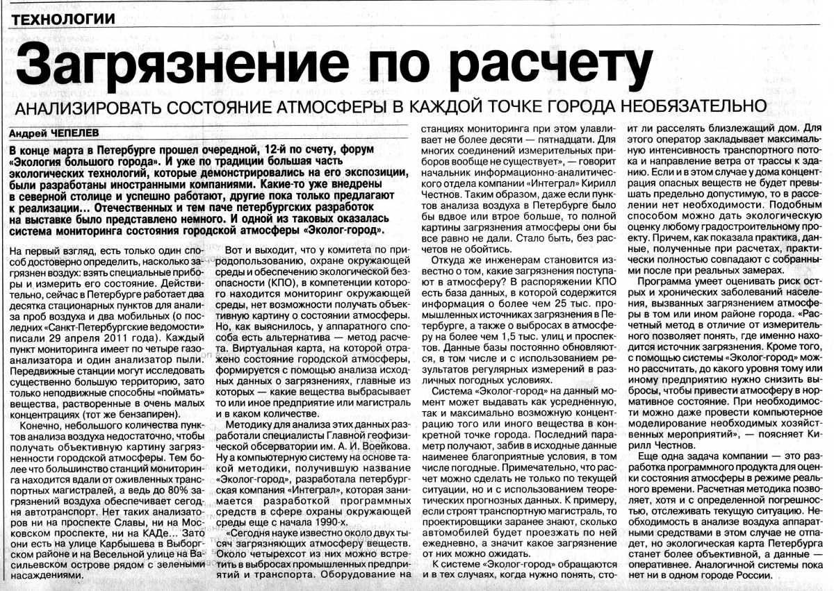Методику для анализа этих разработали специалисты Главной геофизической обсерватории им. А. И. Воейкова. Ну а компьютерную систему на основе этой методики, получившую название "Эколог-город", разработала петербургская компания "Интеграл", которая занимается разработкой программных средств в сфере охраны окружающей среды еще с начала 1990-х.