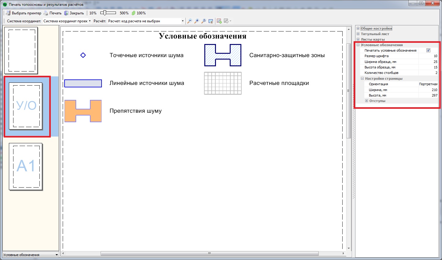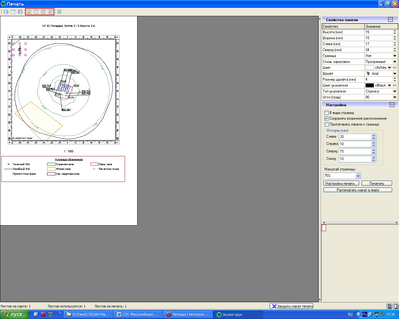 Мне бы хотелось, как было в прошлой версии программы, в окне печати карт, можно было добавить (с помощью кнопки в меню) условные обозначения, картограмму звукового поля, а при необходимости и убратьВадим Зыков писал(а):Напишите, пожалуйста, подробнее как вы хотели бы что бы программа добавляла или исключала информацию из легенды (промышленная зона, СЗЗ, точечный, линейный источник, препятствия шума).