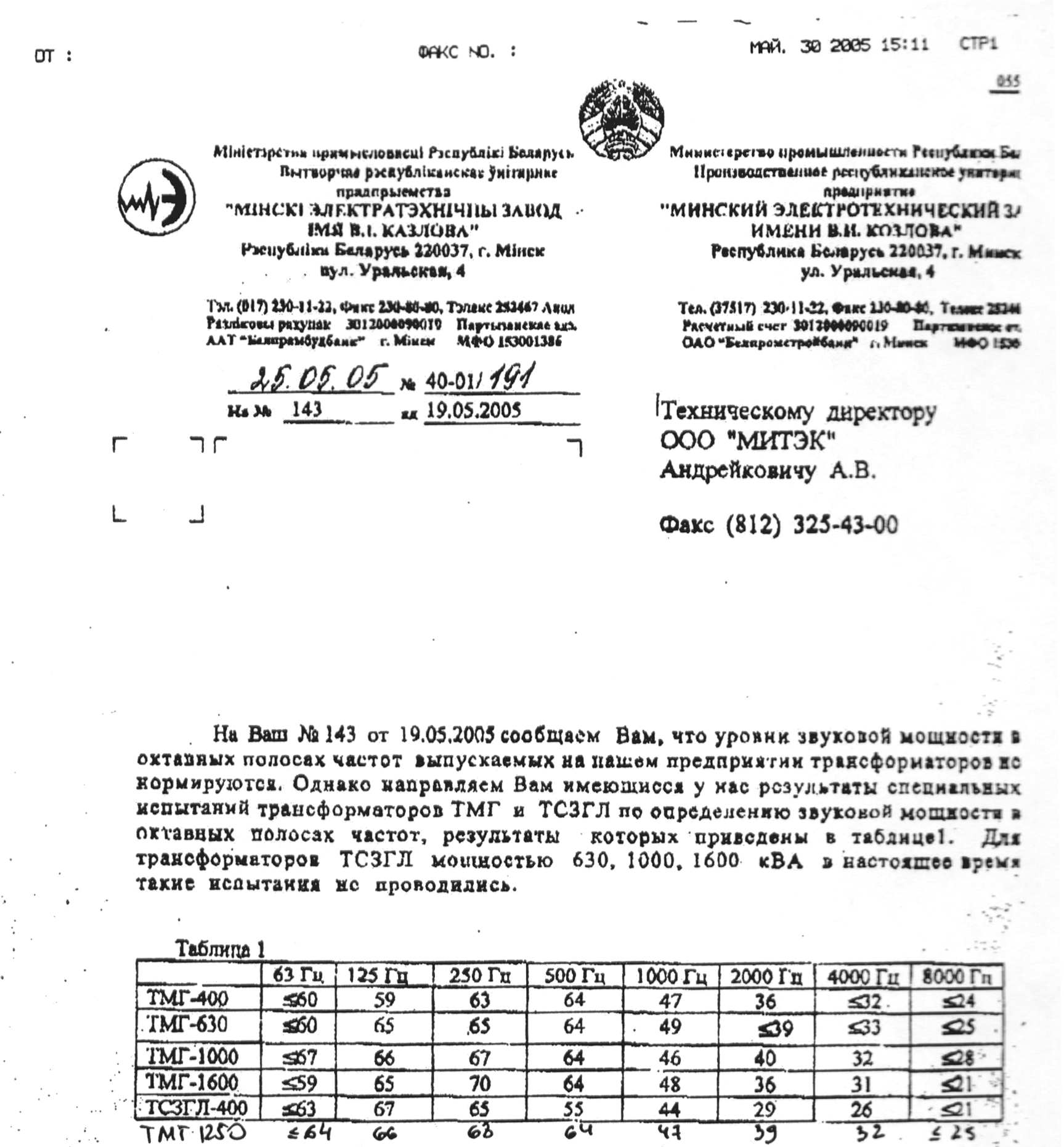 Выкопировка из каталога продукции Минского электротехнического завода им. В. И. Козлова "Силовые трансформаторы" с шумовыми характеристиками трансформаторов.