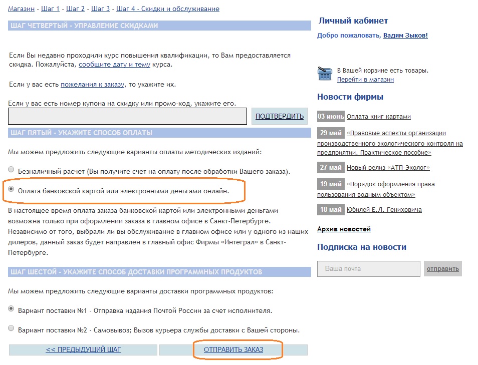 3. Выбор способа доставки «Самовывоз» означает ваше желание получить книги в нашем офисе в Санкт-Петербурге.