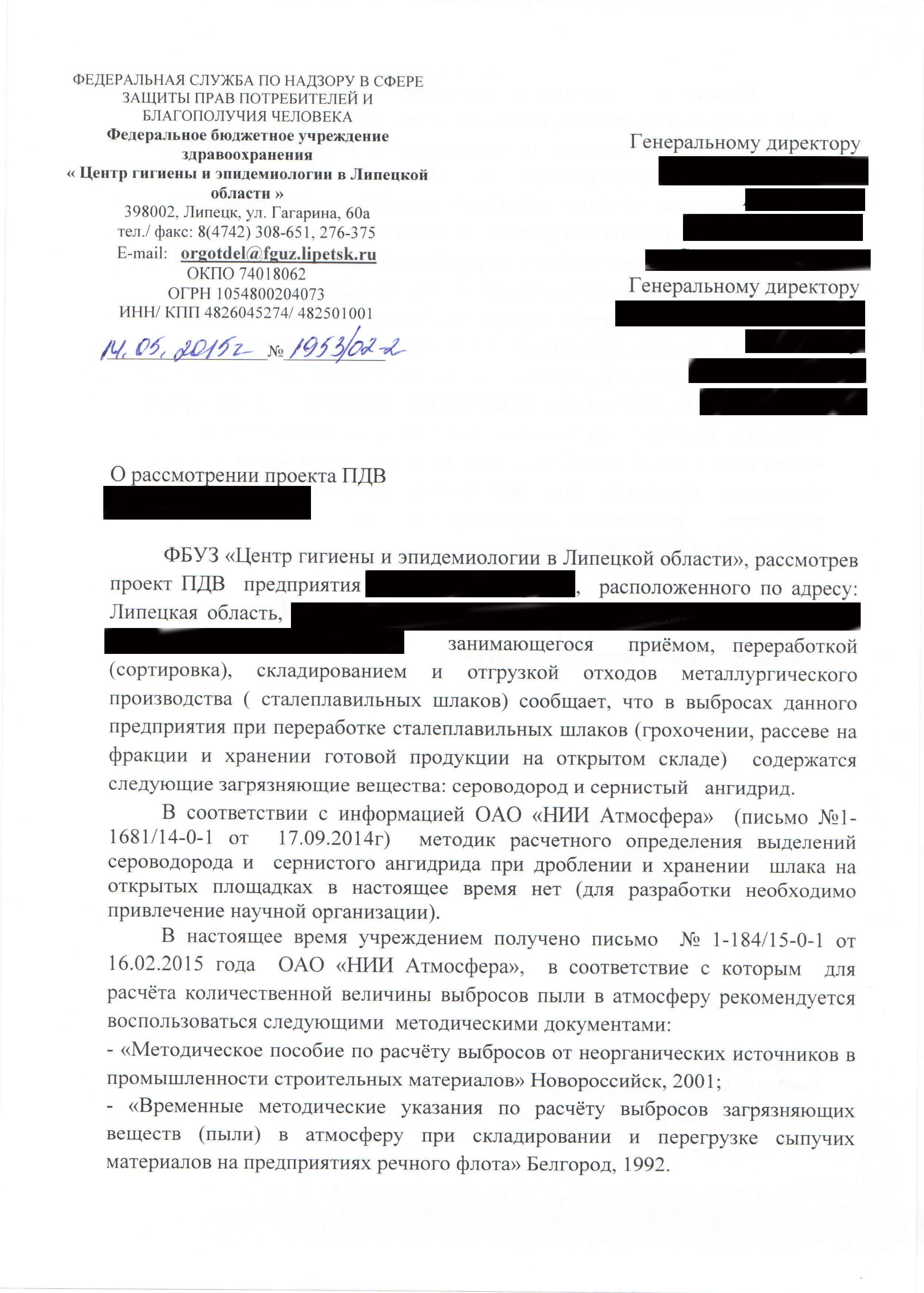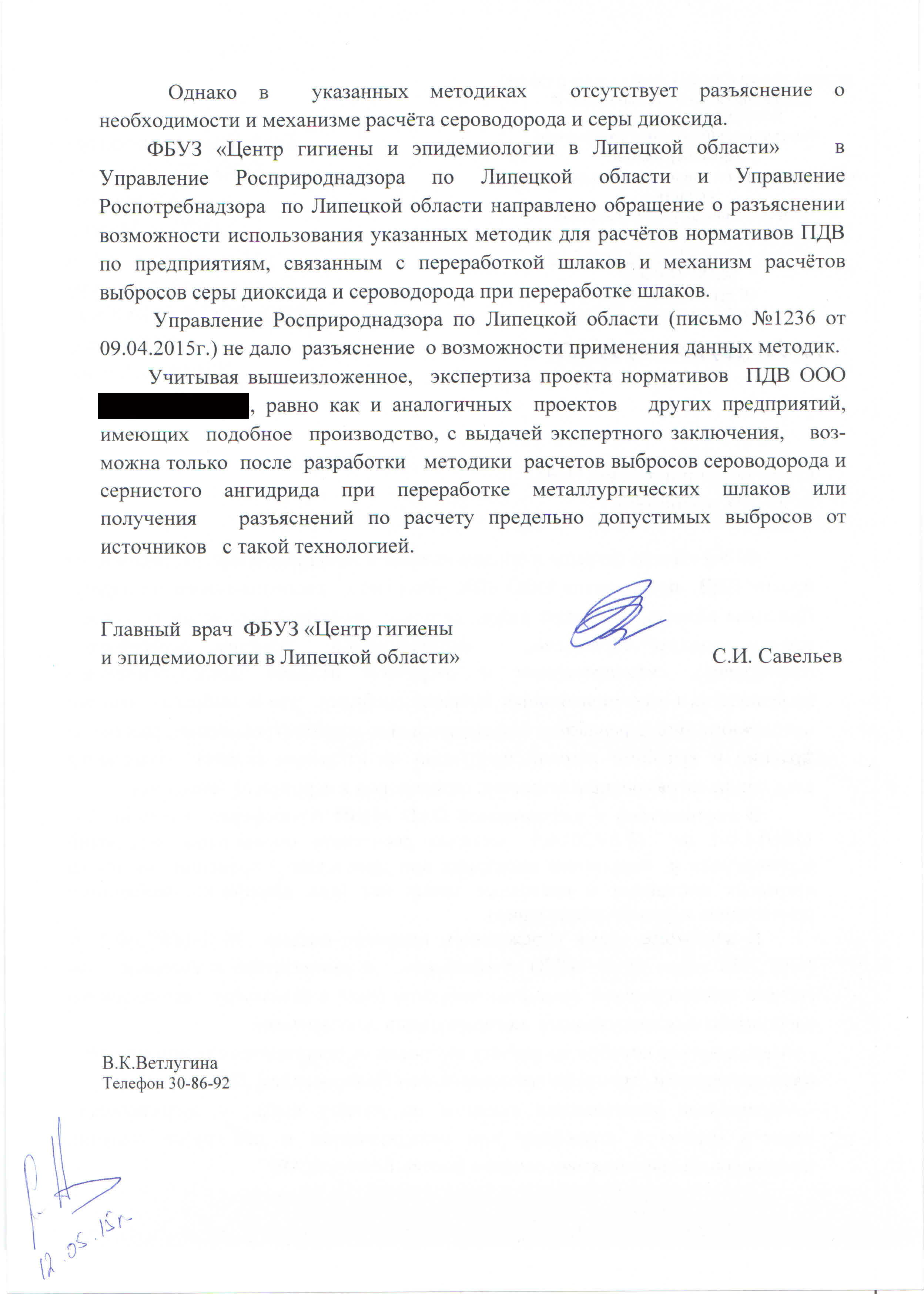 Здравствуйте, на днях получили письмо ФБУЗ, в котором они отказывают в рассмотрении проекта ПДВ на том основании, что предприятие занимается переработкой шлака (дробление, сортировка), а при переработке шлака якобы в атмосферу выделяется сероводород, а методик для его расчета нет. Само письмо прикладываю. Посоветуйте, как быть.