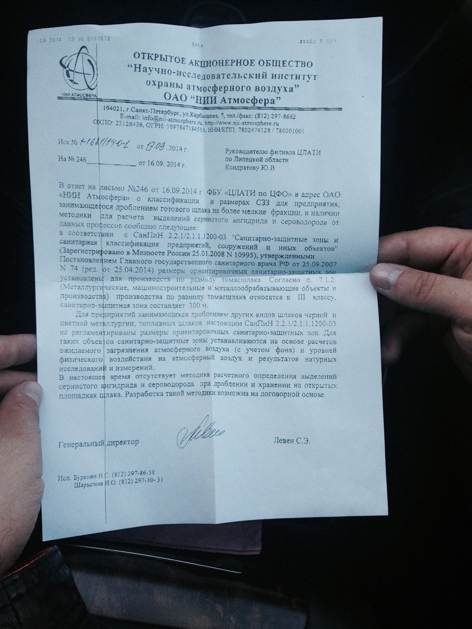 По всей видимости отправной точкой всей истории стал последний абзац вот этого письмо НИИ Атмосферы (извините за качество, другого варианта нет): Но разве можно на таком основании делать однозначный вывод о присутствии сероводорода и диоксида серы при дроблении шлаков? Бред какой-то. У меня складывается следующий путь дальнейших действий --> письмо в МИСиС --> запрос в природоохранную прокуратуру. Ведь приходится доказывать, что ты не верблюд.