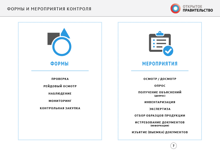 - формы государственного, муниципального контроля и надзора (проверка, рейдовый осмотр, наблюдение, мониторинг и контрольная закупка);