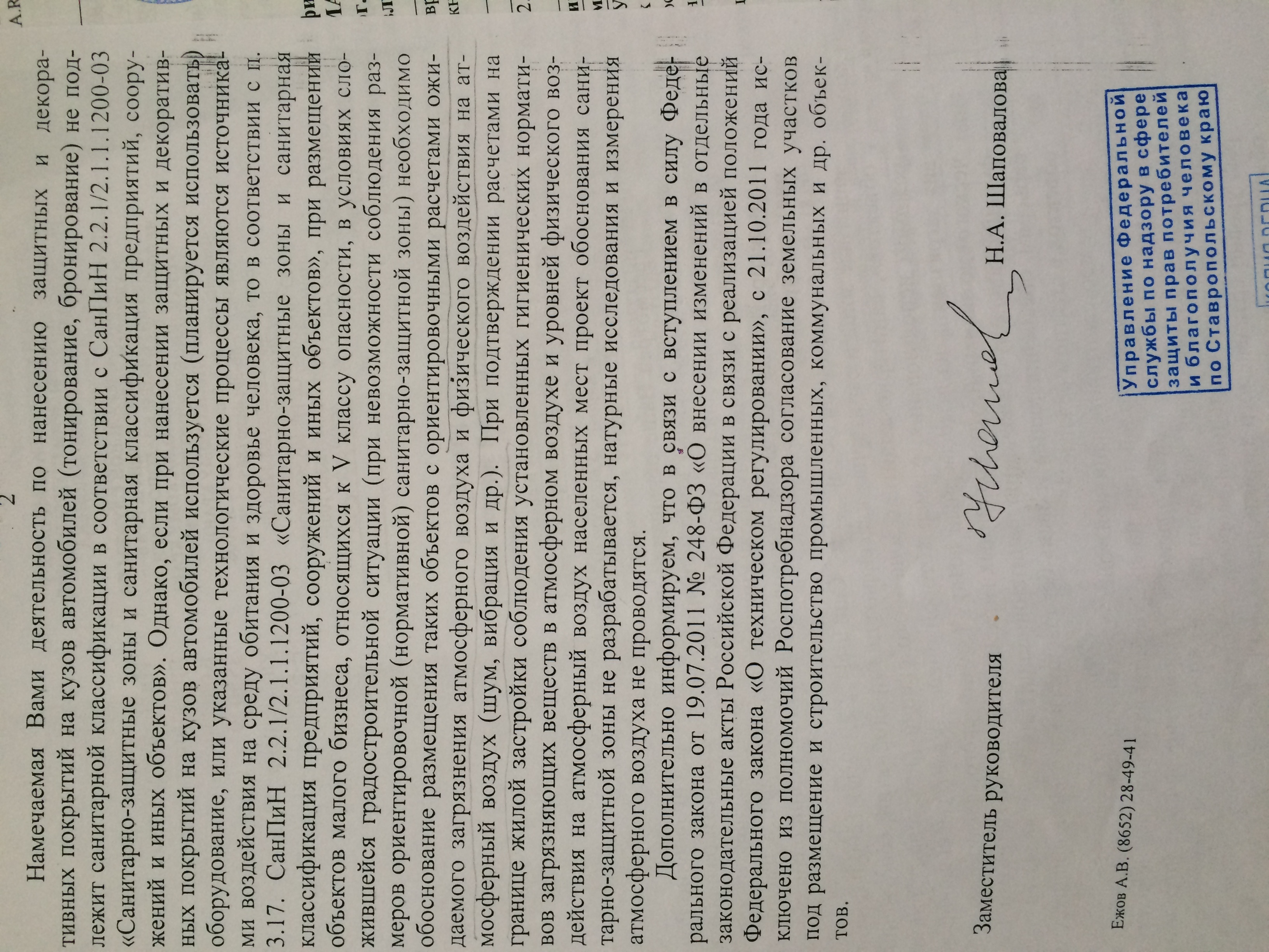 Записываюсь на приём к Главному Чиновнику по вопросам Землепользования для консультации. Он разъясняет;-" Ты обоснуй что не влияешь негативно на окружающую среду и жизнидеятельность в близи живущих людей своим декоративным нанесением плёнок на кузов и стекло, тогда посмотрим изменить вид или нет!" СРАЗУ ЖЕ КО МНЕ ПРИЕЗЖАЕТ РОСПОТРЕБНАДЗОР С ПРОВЕРКОЙ !ДЕЯТЕЛЬНОСТЬ ТОЛЬКО ОРГАНИЗОВЫВАЛАСЬ И ЕЩЁ НЕ ВЕЛАСЬ; В ПОМЕЩЕНИИ (ГАРАЖЕ ШЁЛ РЕМОНТ, И ОРГАНИЗАЦИЯ). Вообщем отработали они заявление то ли председателя, то ли жителей ближайших домовладений, возбудив дело и сразу прекратив в виду отсутствия предпринимательской деятельности в данном гараже.