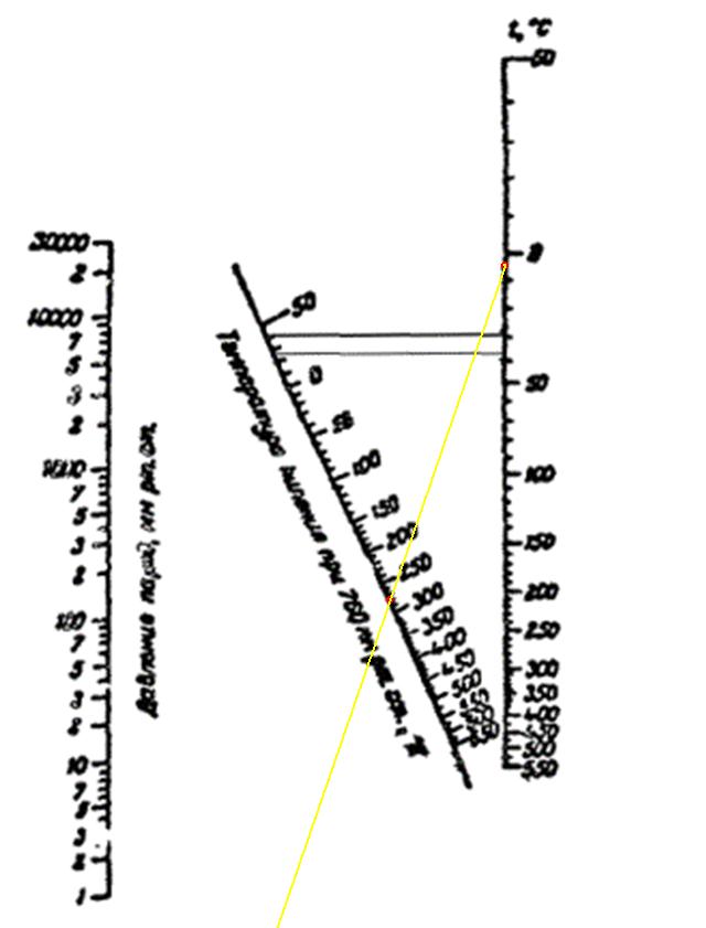 Номограмма 1 Взяла координаты для гексадекана, поставила точку на номограмме. По идее, проводится прямая от шкалы температуры через точку к шкале давления? Так моя прямая уходит мимо шкалы.